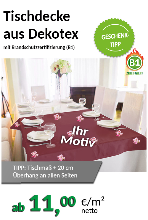 • Gestalten Sie Ihre individuell bedruckte Tischdecke und verleihen Sie Ihren Räumen einen besonderen Charakter. Unsere Tischdecken werden aus Dekotex mit Brandschutzzertifizierung (B1) gefertigt. Sie haben die Möglichkeit, Größe, Farbe und Design nach Ihren Vorstellungen auszuwählen. Gestalten Sie Ihre Tischdecke zum Beispiel mit Ihrem Firmenlogo, Bildern oder Texten.
